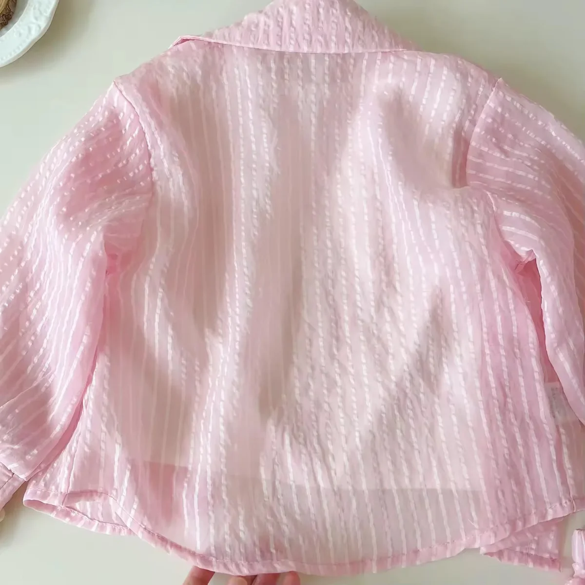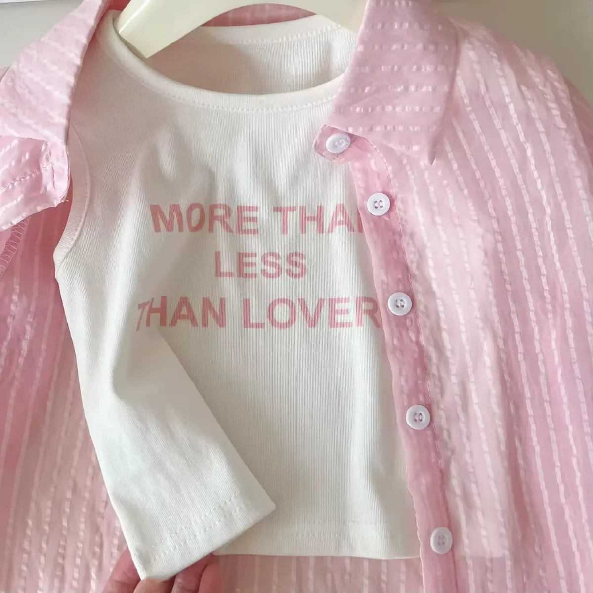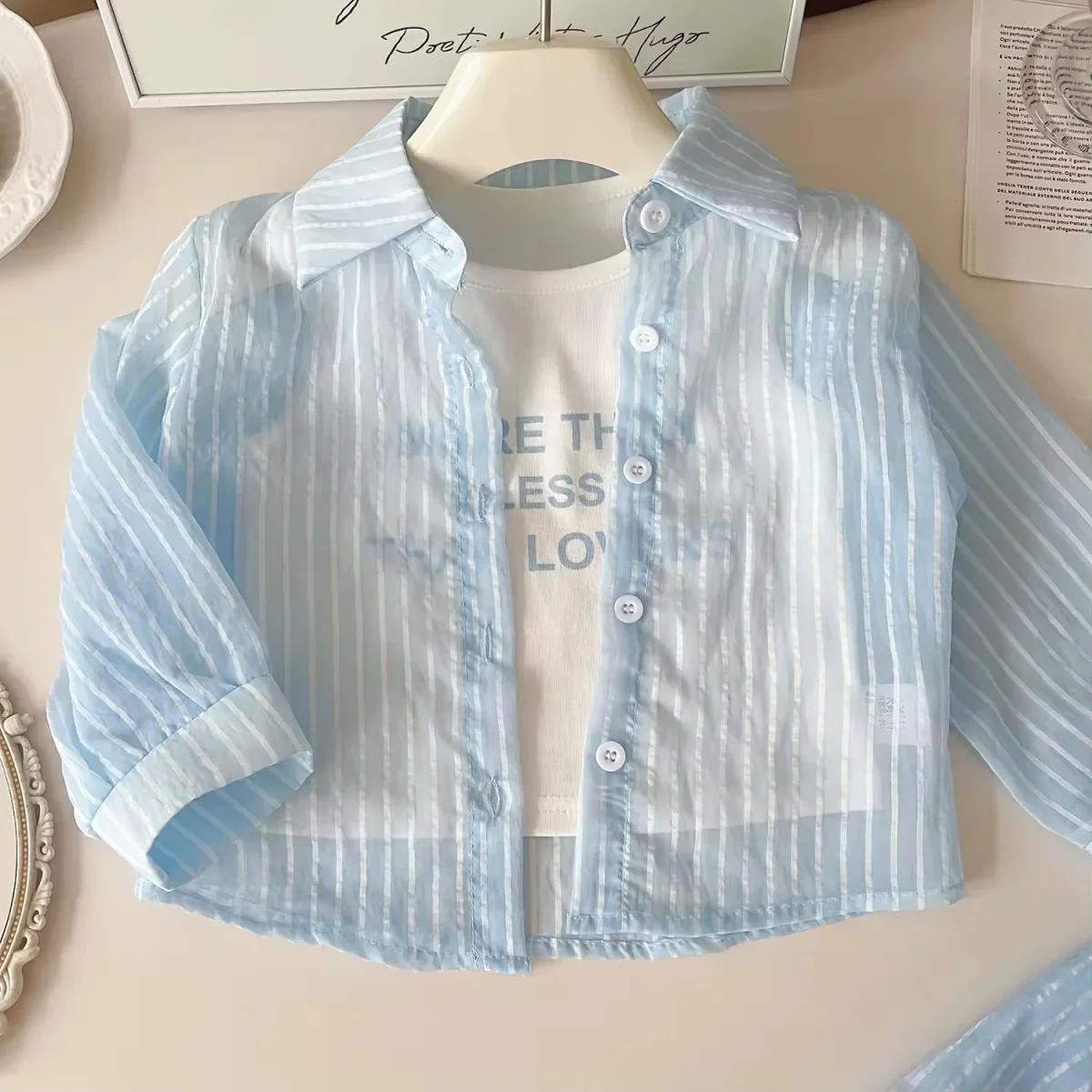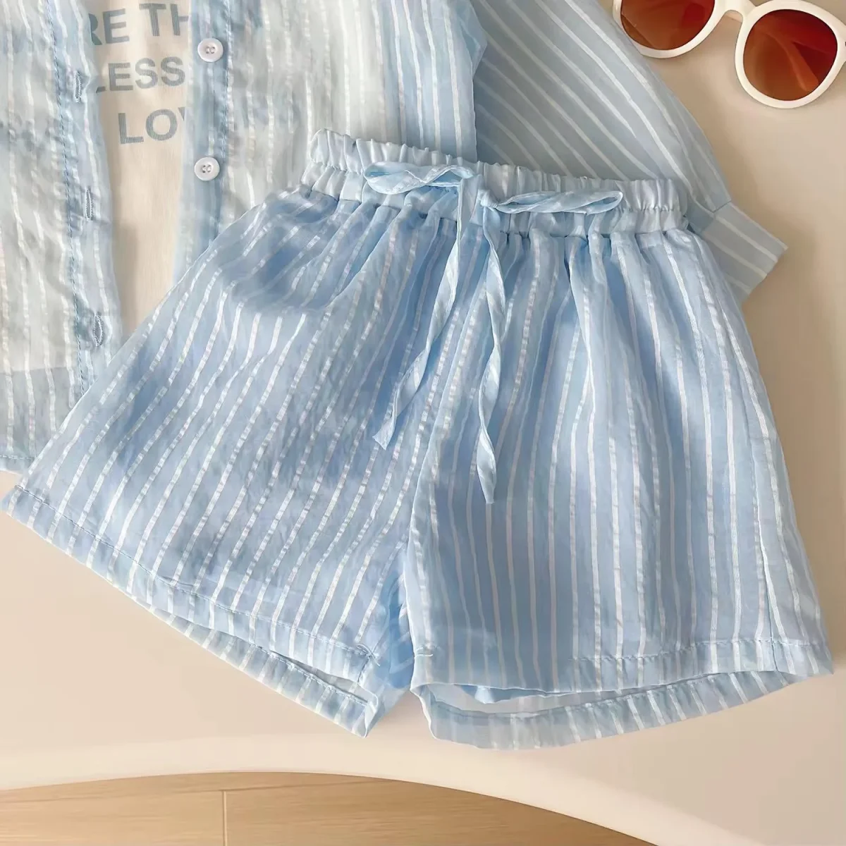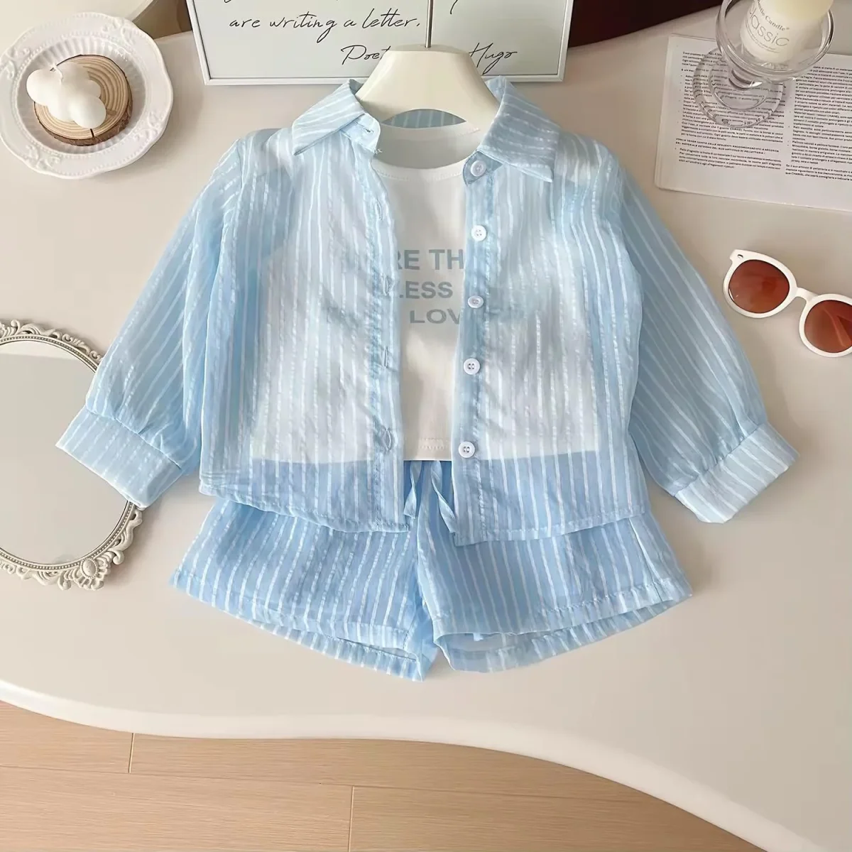 Delicato e fresco, questo completo da bambina รจ perfetto per le giornate estive. Composto da camicia leggera a righe, canotta con stampa e shorts abbinati, unisce stile e comoditร per ogni occasione.