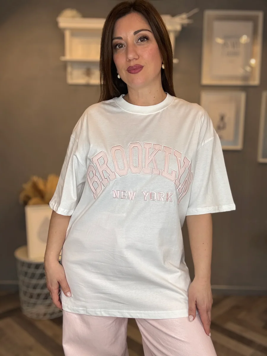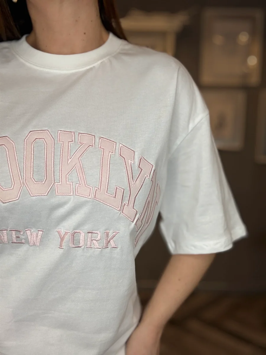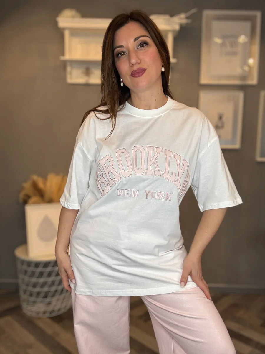 T-shirt BROOKLYN dallo stile casual e contemporaneo, perfetta per chi ama un look rilassato ma curato. Il design oversize e la vestibilitร morbida la rendono ideale da indossare ogni giorno, mentre la stampa ricamata tono su tono con scritta โBROOKLYNโ dona un tocco urbano e femminile. Versatile e confortevole, รจ il capo passe-partout da abbinare a jeans, pantaloni morbidi o shorts.