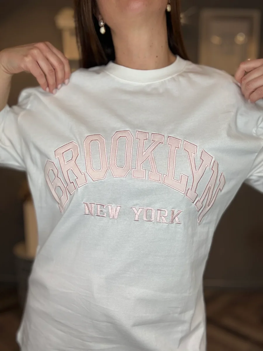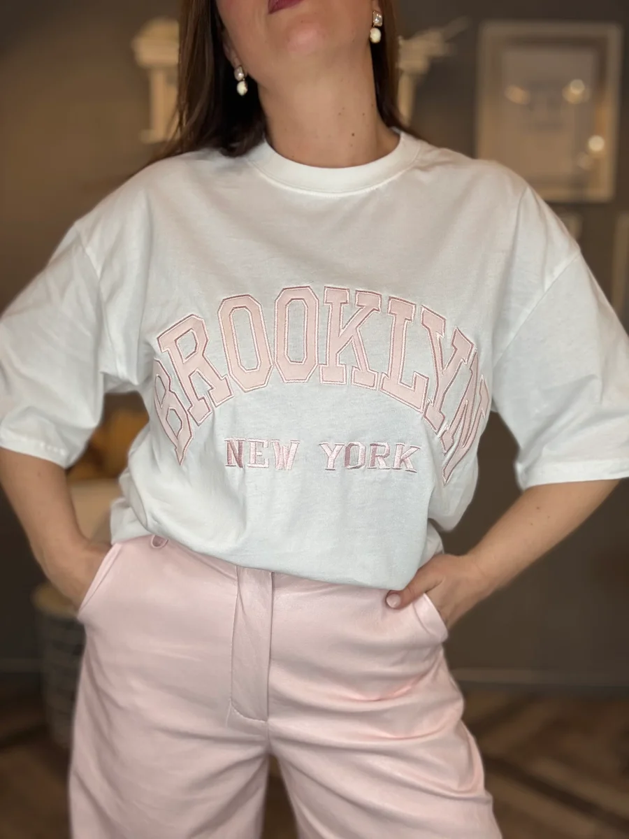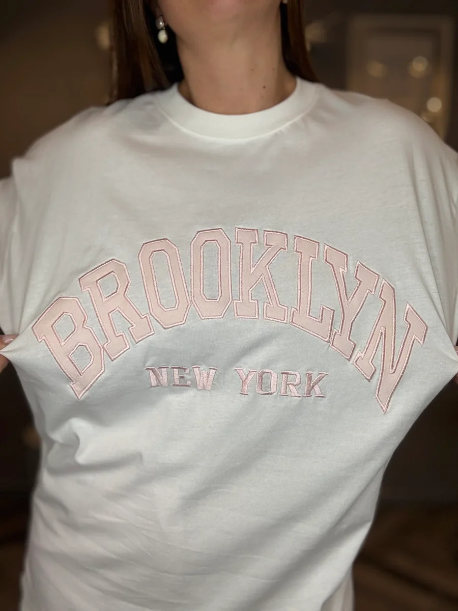 T-shirt BROOKLYN dallo stile casual e contemporaneo, perfetta per chi ama un look rilassato ma curato. Il design oversize e la vestibilitร morbida la rendono ideale da indossare ogni giorno, mentre la stampa ricamata tono su tono con scritta โBROOKLYNโ dona un tocco urbano e femminile. Versatile e confortevole, รจ il capo passe-partout da abbinare a jeans, pantaloni morbidi o shorts.
