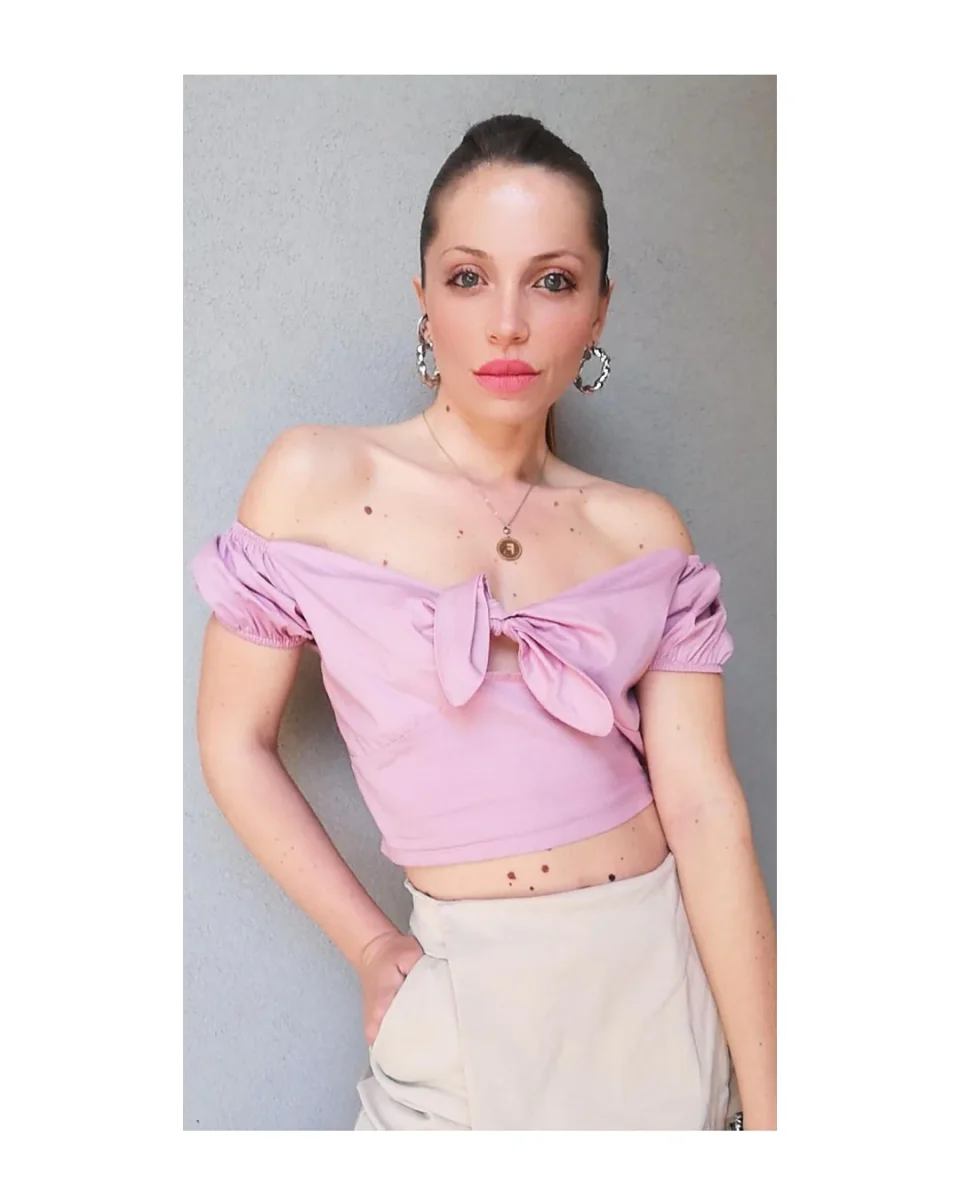 In cotone, color rosa tenue con fiocco centrale ed apertura sul seno, modello crop con elastico dietro la schiena!