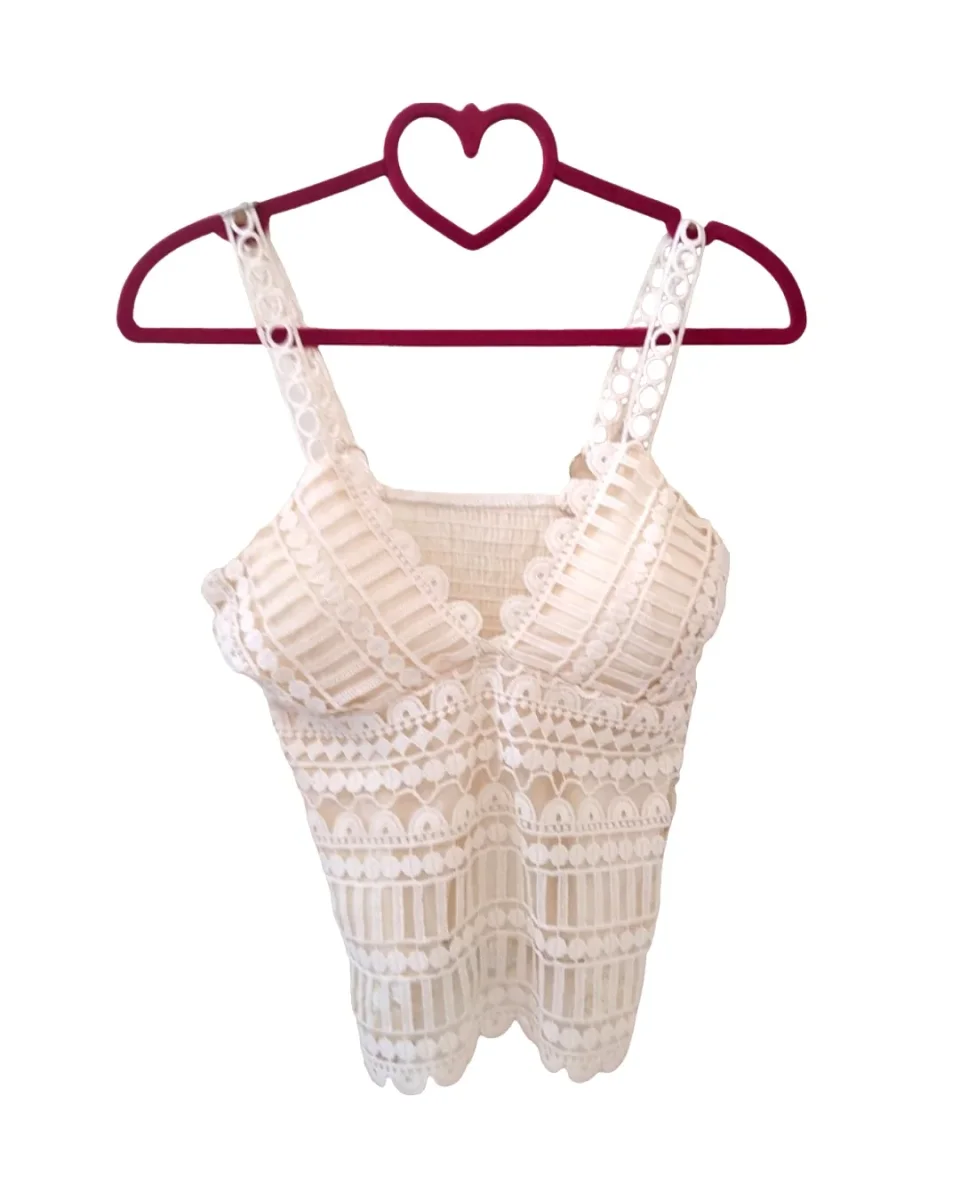 Top bustier strutturato e ricco di dettagli: modello corto o regular con coppa preformata e scollo a V, spallina regolabile fina in merletto, elastico dietro la schiena, doppio pizzo coprente nella parte del seno..