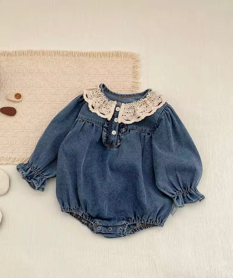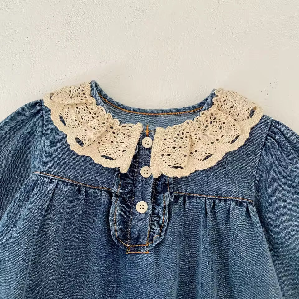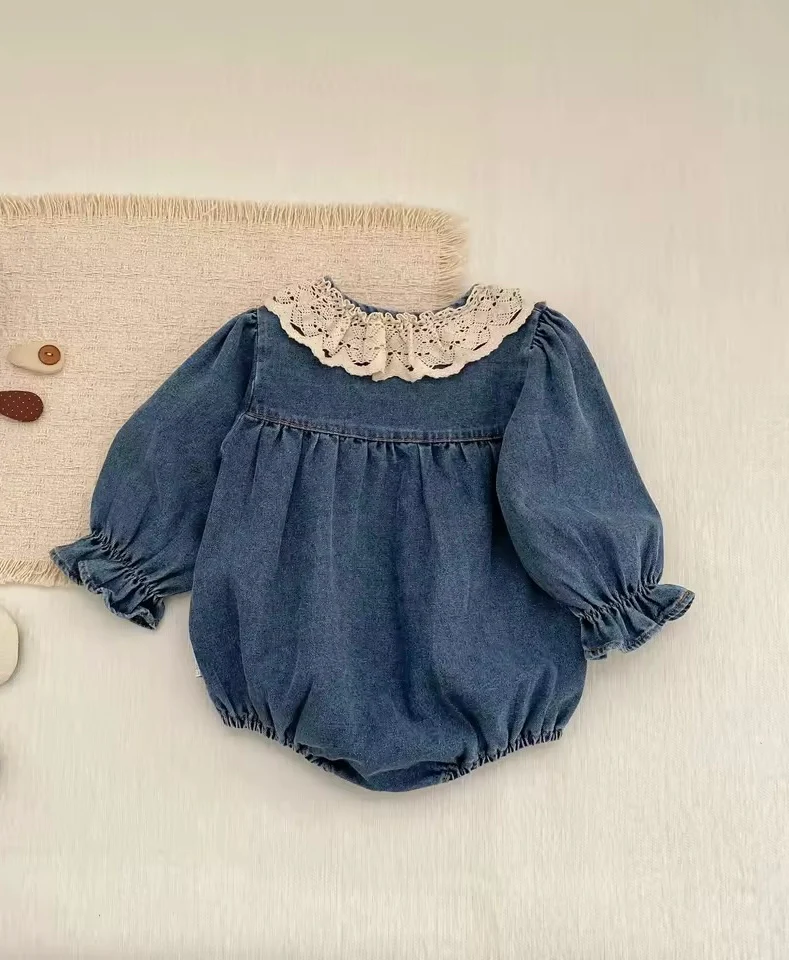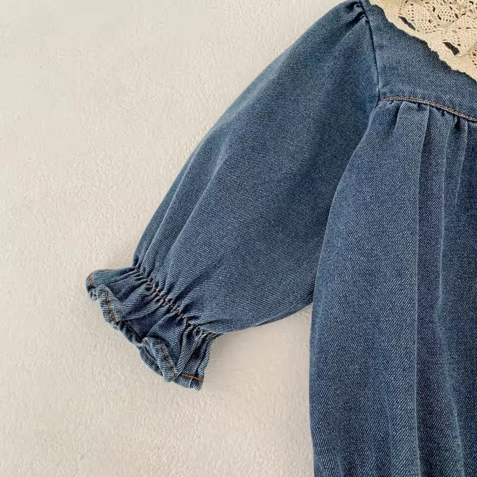 Aggiungi un tocco di stile senza tempo al guardaroba della tua piccola con questa adorabile tutina in denim da bambina, un mix perfetto tra praticitร e charme. Realizzata in morbido denim leggero, presenta maniche lunghe con morbida arricciatura, una gonnaโculotte effetto bloomers e un irresistibile colletto in pizzo crema che dona unโeleganza romantica.