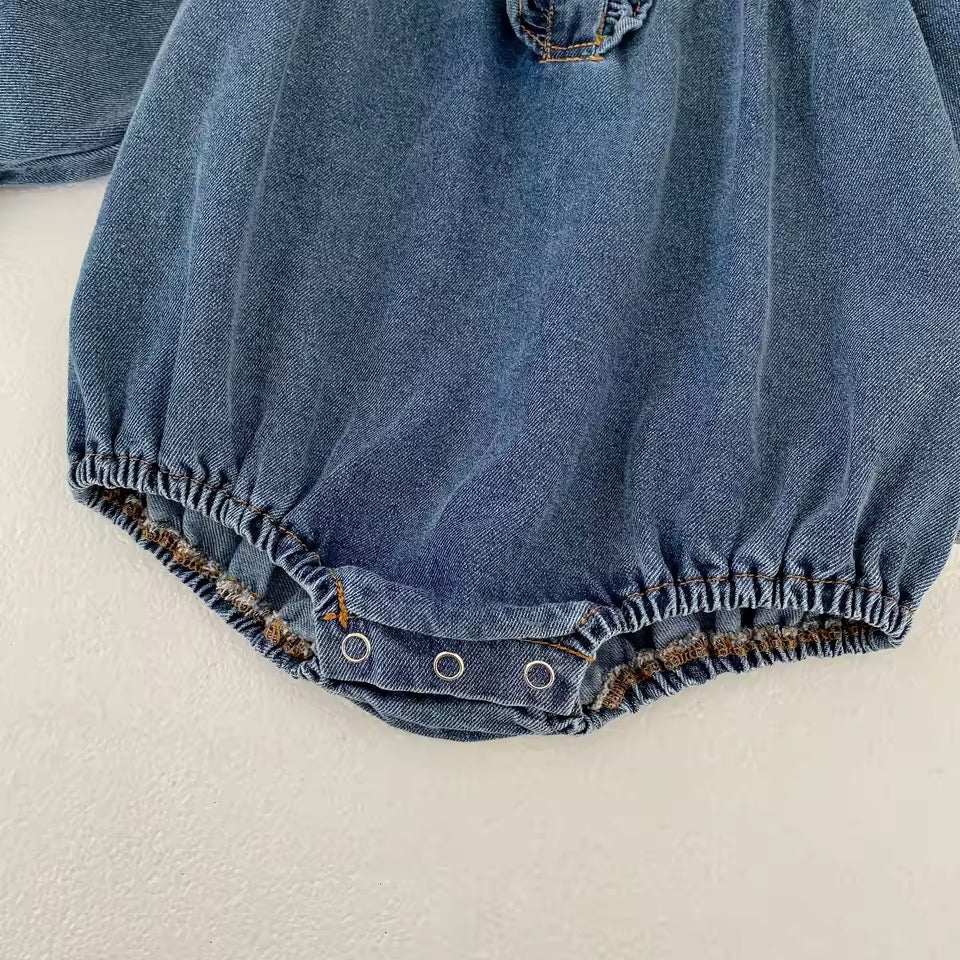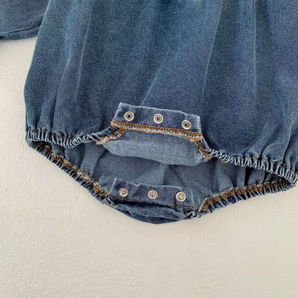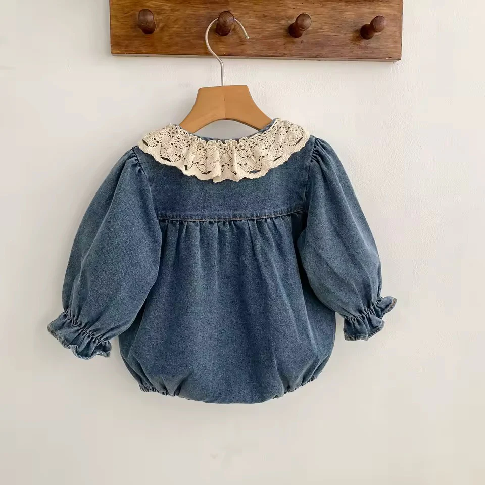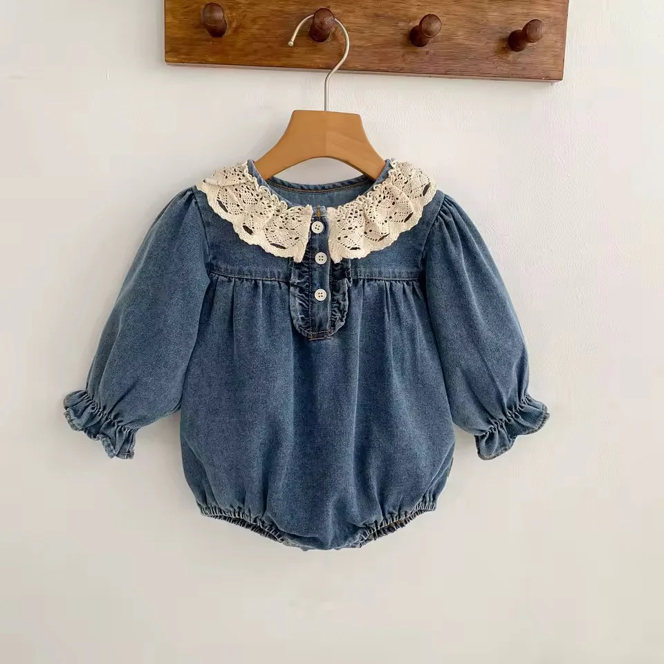 Aggiungi un tocco di stile senza tempo al guardaroba della tua piccola con questa adorabile tutina in denim da bambina, un mix perfetto tra praticitร e charme. Realizzata in morbido denim leggero, presenta maniche lunghe con morbida arricciatura, una gonnaโculotte effetto bloomers e un irresistibile colletto in pizzo crema che dona unโeleganza romantica.