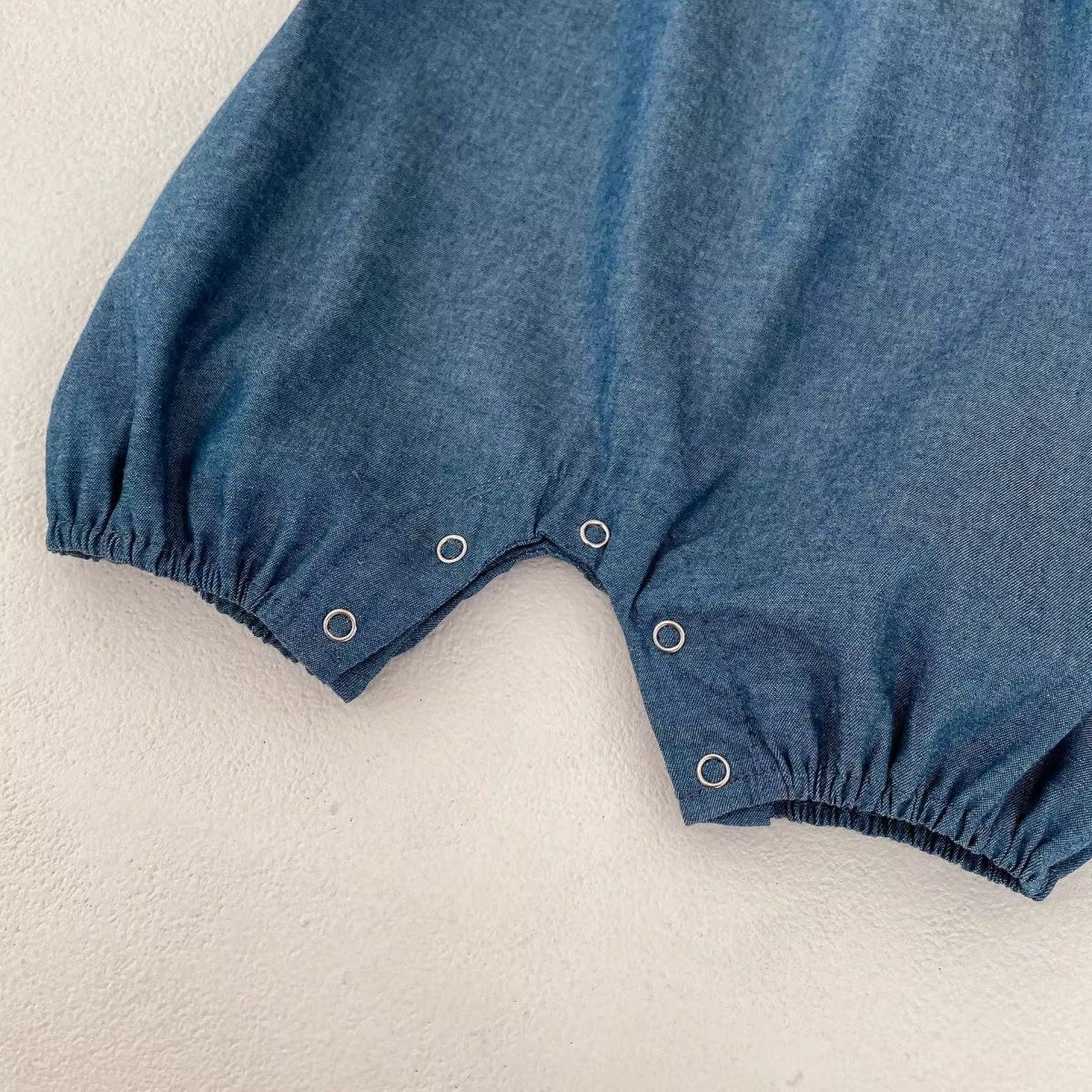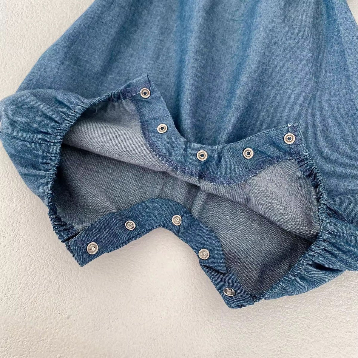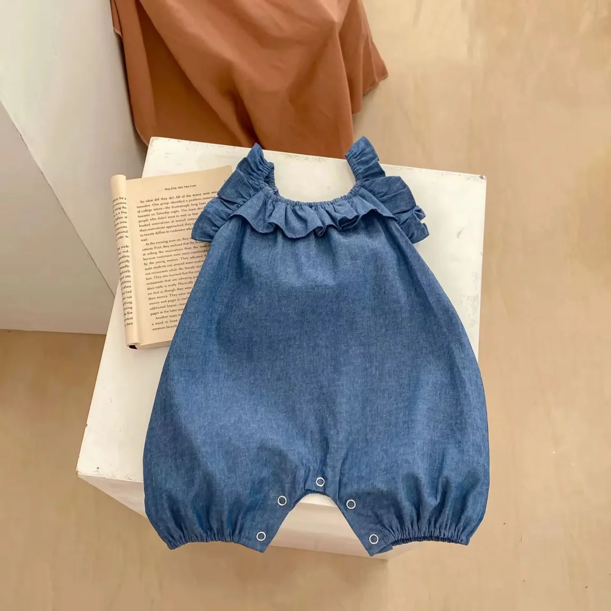 Fresca, comoda e super trendy! La tutina “Parisienne” รจ realizzata in morbido tessuto effetto jeans, con deliziosi volant sulle spalline per un tocco romantico. Perfetta per le giornate estive, grazie alla chiusura con bottoncini sul fondo per un cambio facile e veloce.