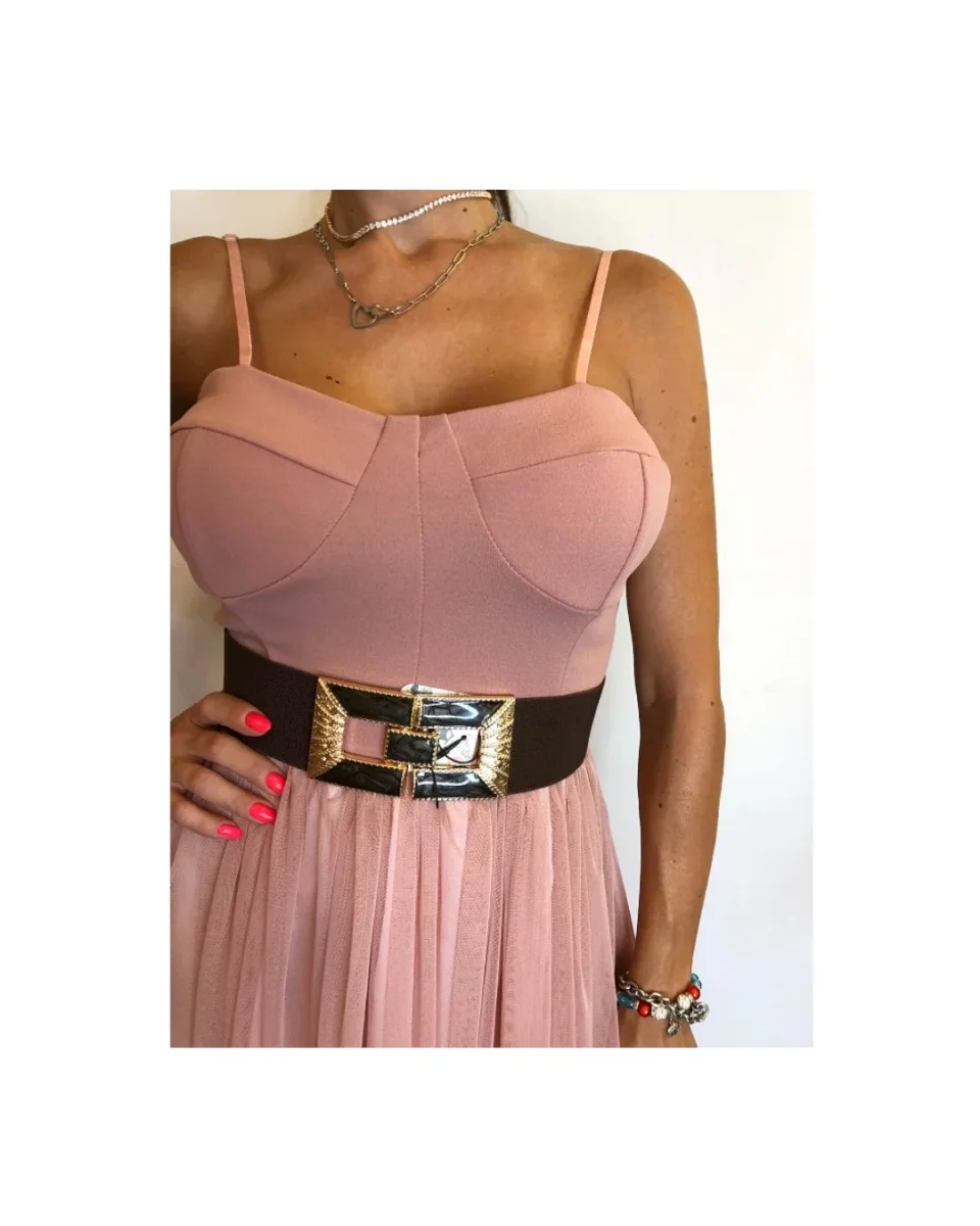 Corpetto bustier con coppe preformate, spallina fina regolabile, nuvola di strati di tulle compongono la gonna, nuance rosa cipria adatta ad occasioni eleganti e cerimonie!