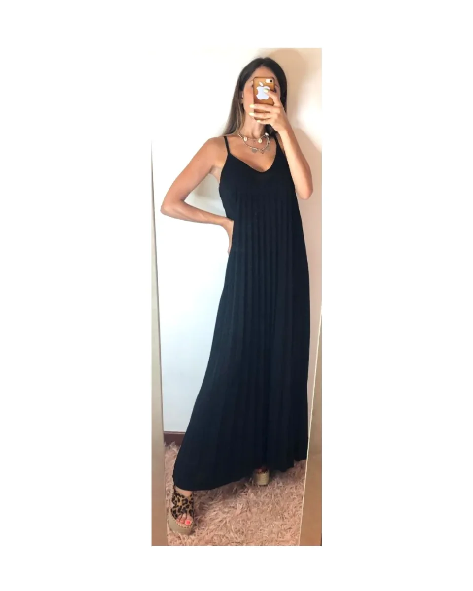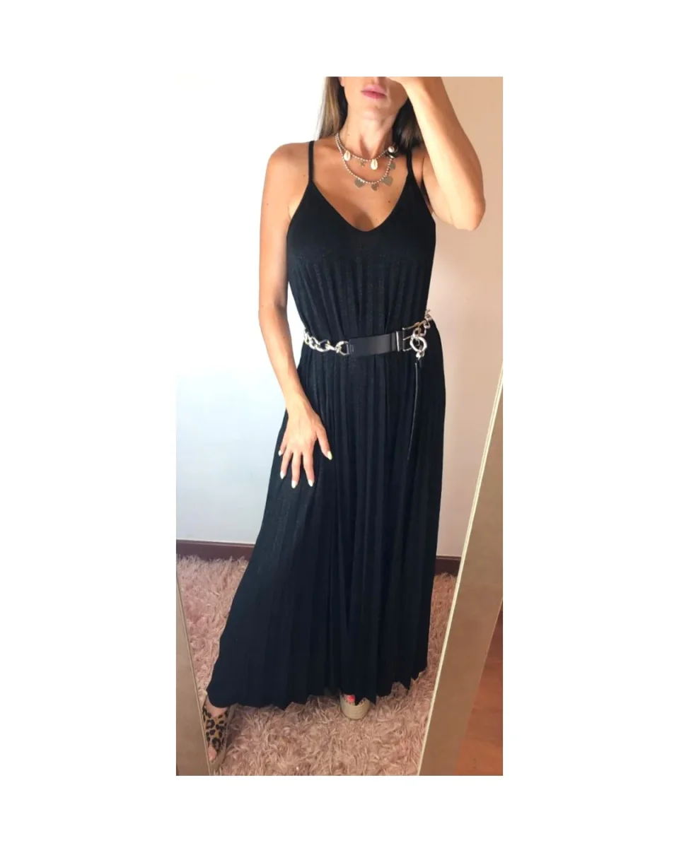 Classico modello lungo con plissettatura, morbido ed ampio nella vestibilità, femminile scollo a V, bretellina fina e non regolabile, la bellezza del basic lurex che si abbina al nero!