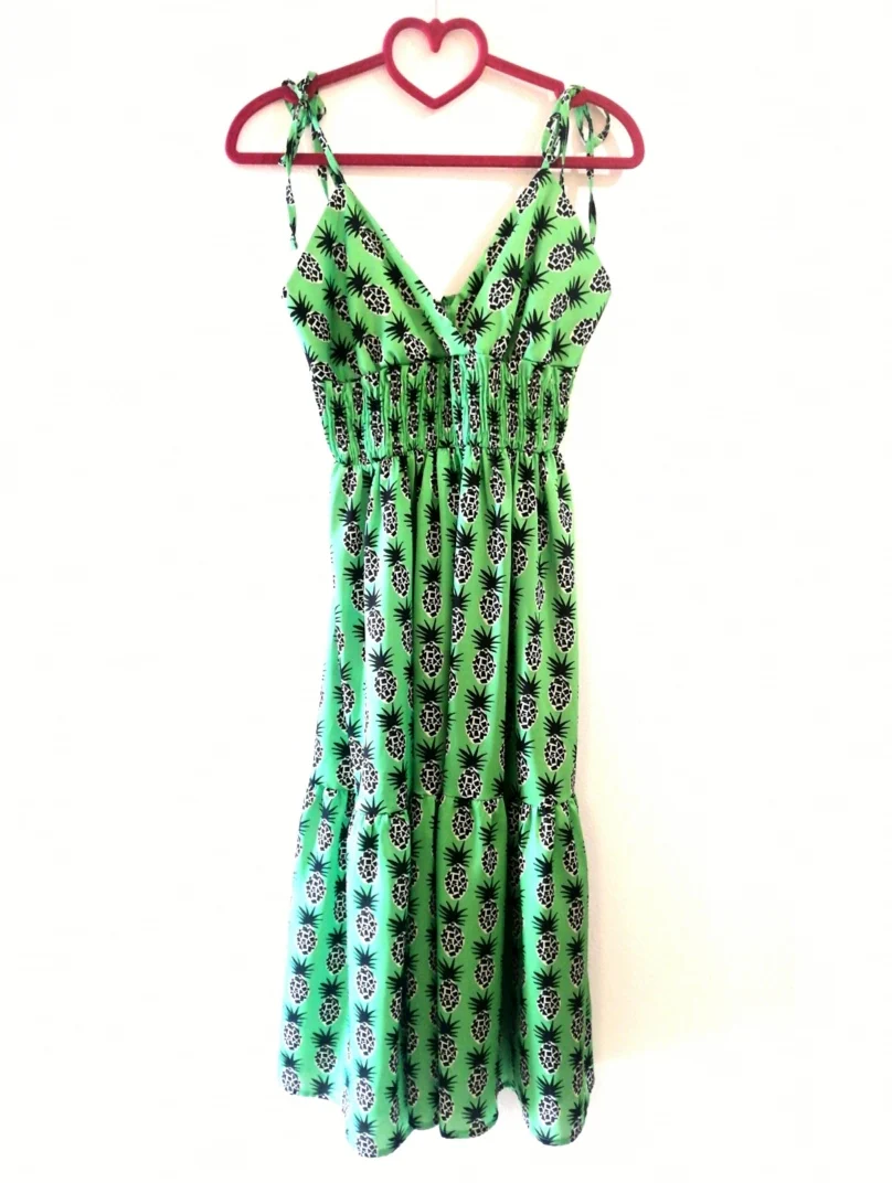 Un vestito può unire tante caratteristiche insieme, questo è il caso..scollo a V, maxi elastico per esaltare il punto vita per poi allargarsi sul fondo con balza, modello longuette con laccetti regolabili sulla schiena, per non parlare della fantasia ananas in un punto di verde lime fresco ed estivo, tessuto scivolato e leggermente satinato!