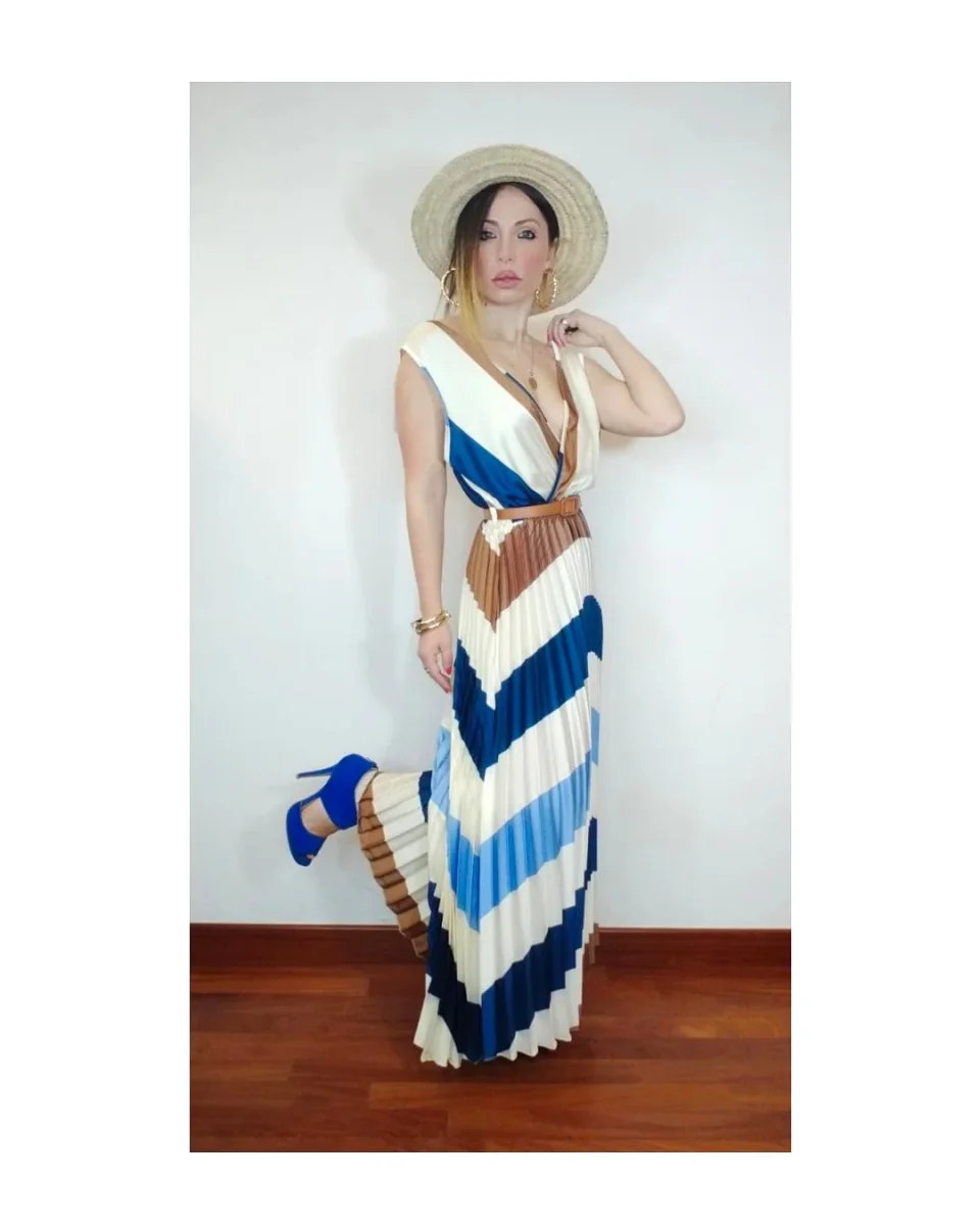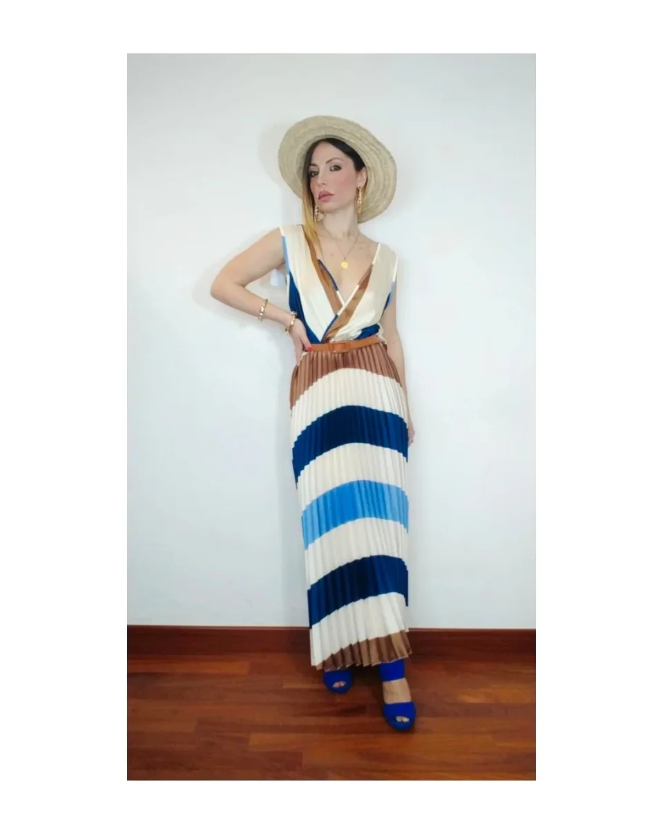 Qualità, classe ed eleganza, leggero e setato, spallina larga con doppio scollo a V e gonna mezza lunghezza plissettata, palette fine in tonalità mare e terra, dotato di passanti e cinturina!