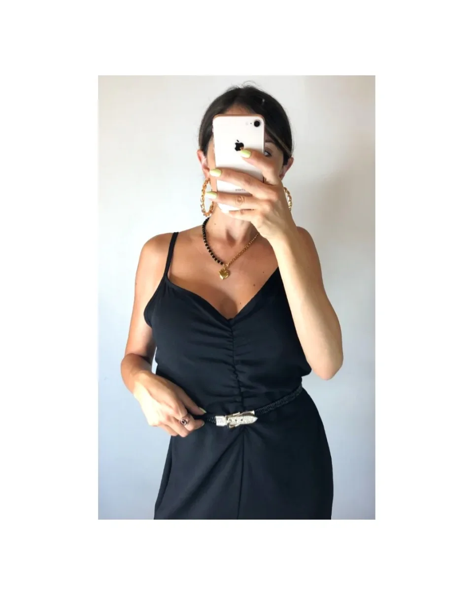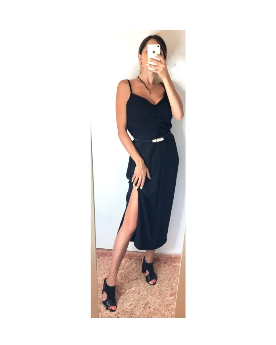 Dritto, basic, tinta unita, semplice ma, allo stesso tempo, comodo e di figura! Scollo a V con arricciatura, spallina fina e non regolabile con elastico dietro la schiena, longuette con spacchetto laterale!