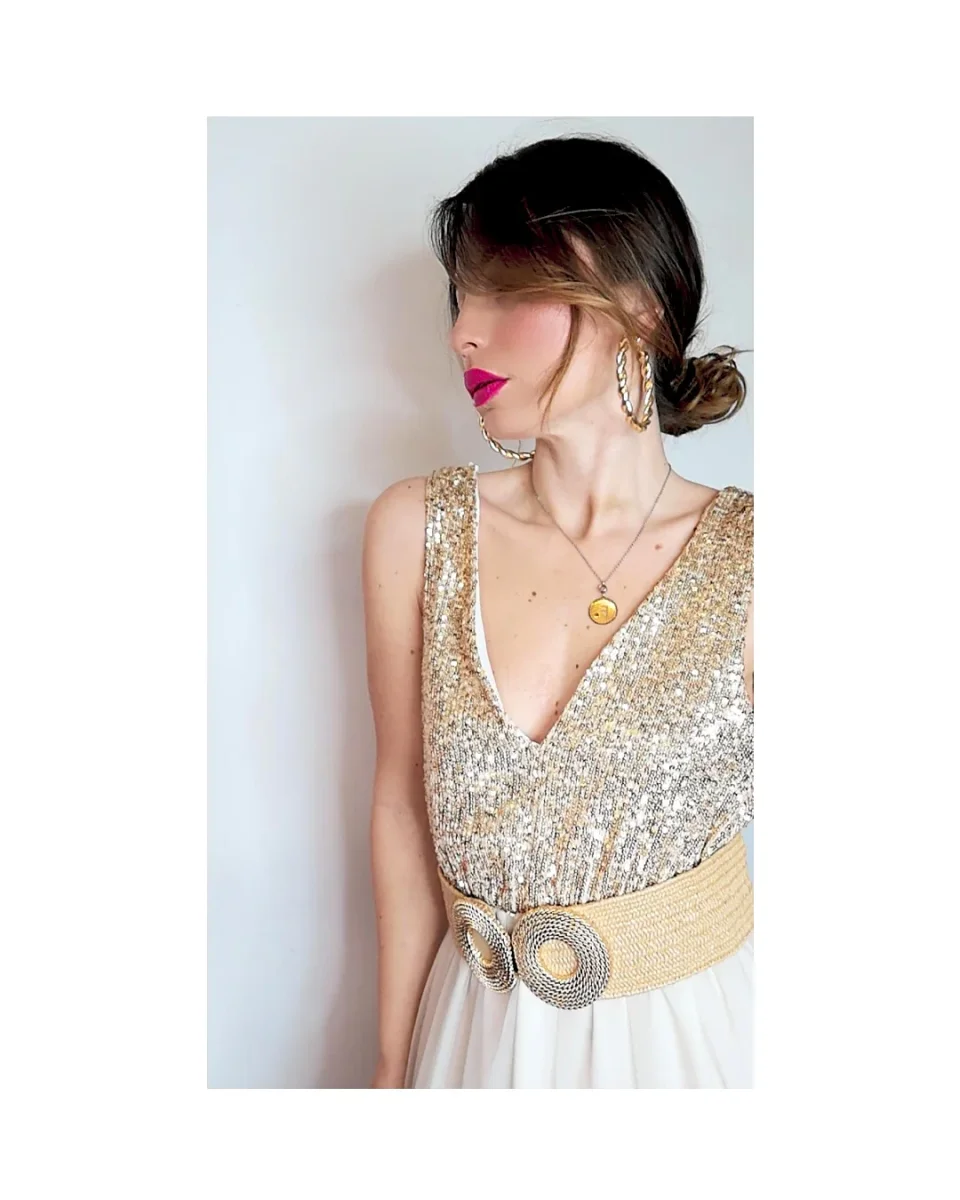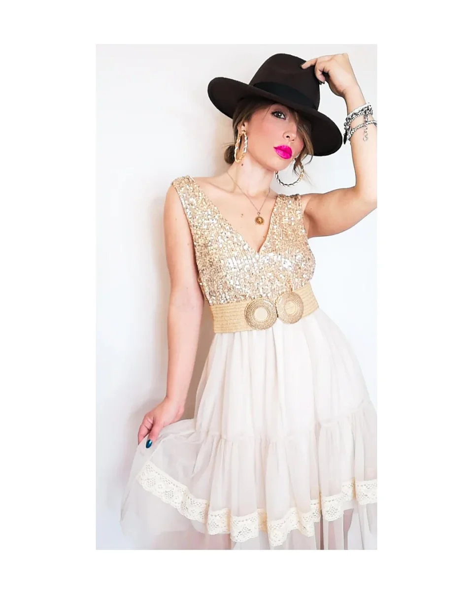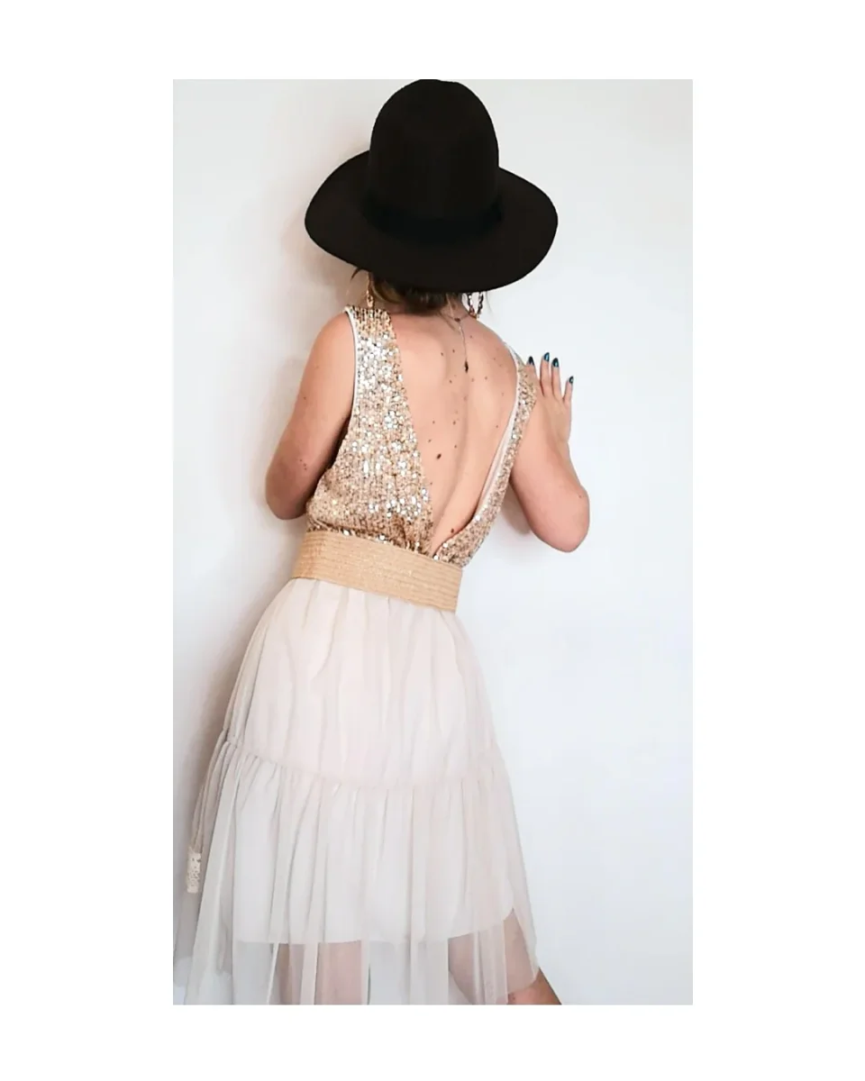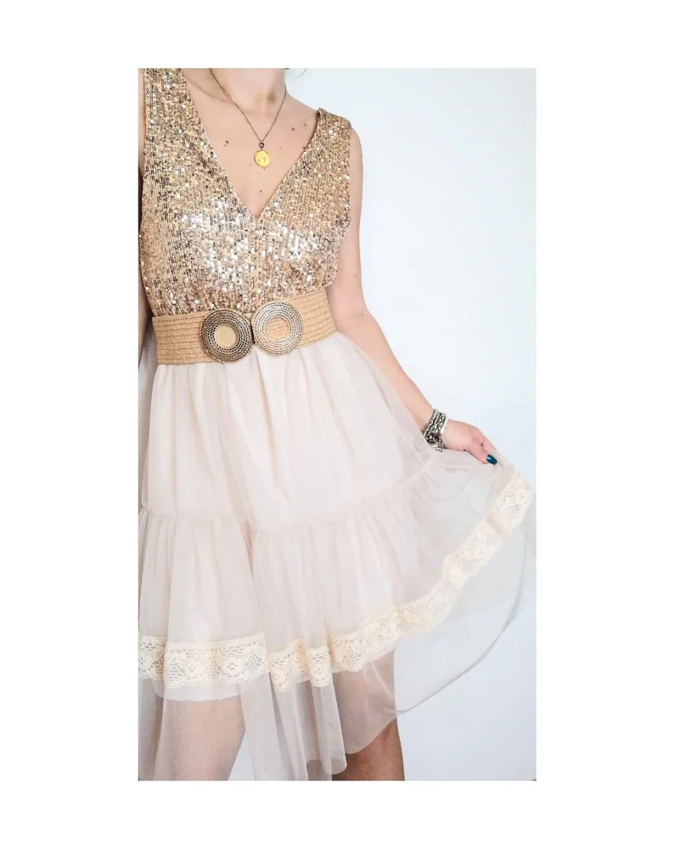 Un piccolo gioiellino BonChic, paillettes oro e tulle con merletto, sottanina interna, doppio scollo al seno e dietro la schiena con elastico in vita, leggero ed elegante, da occasioni, serate o cerimonie.