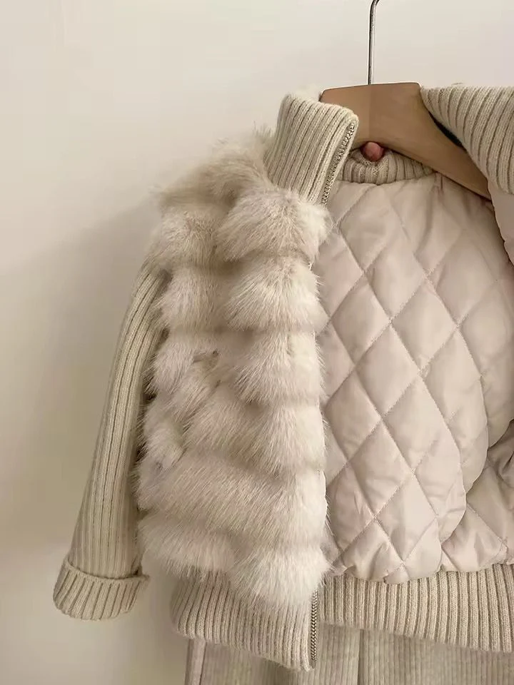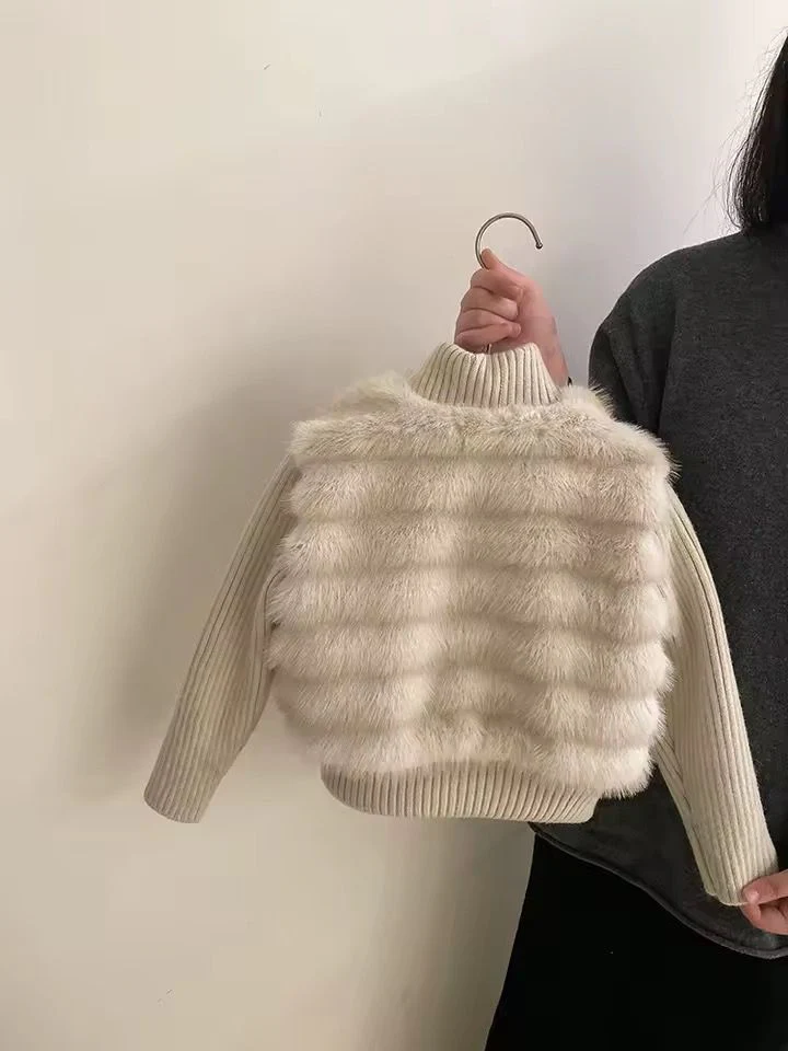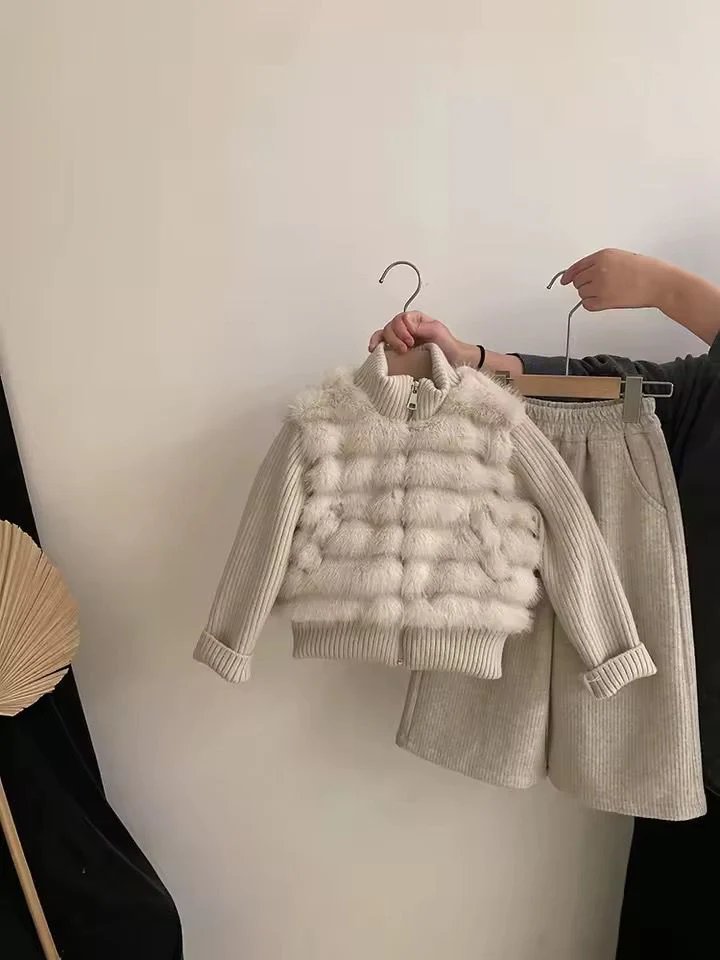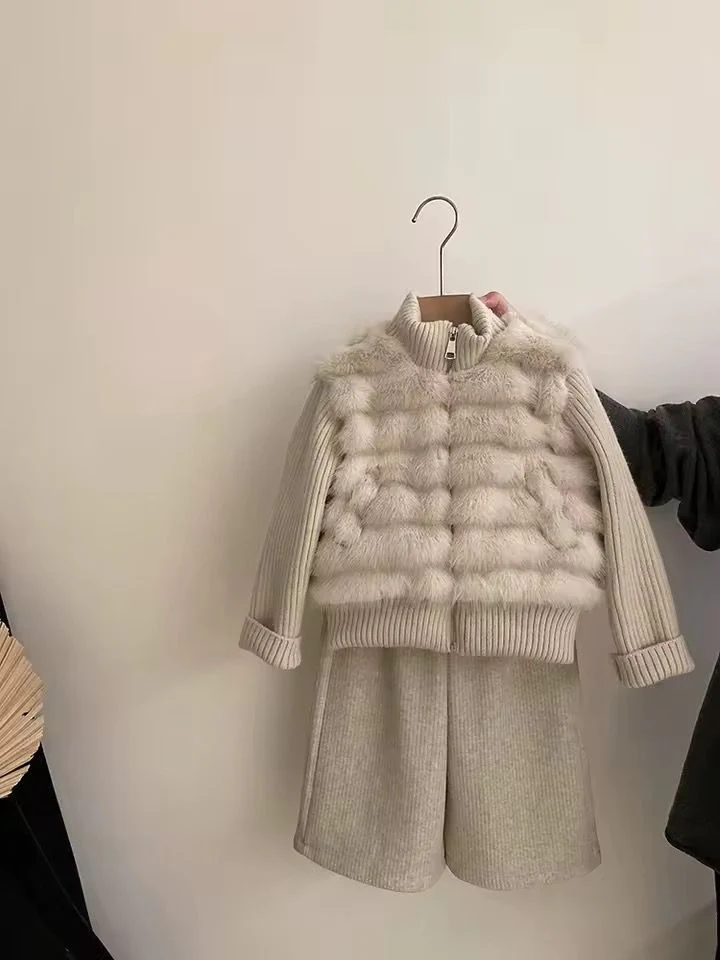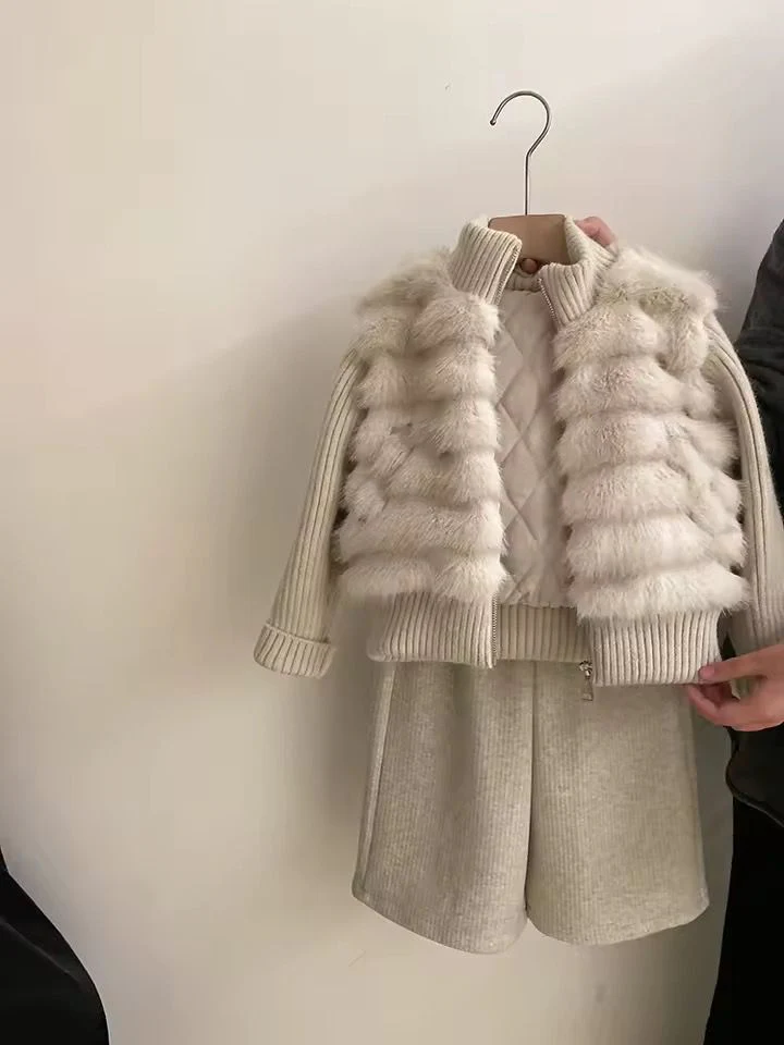 Completo invernale da bambina 2 pezzi composto da pantalone caldo in maglia e felpa con effetto pelliccia integrata. Il capo unisce comfort e stile in un unico look: la parte superiore รจ lavorata a maglia con inserto effetto pelliccia e interno trapuntato, per garantire calore e raffinatezza. Perfetto per le giornate fredde con un tocco glam.
