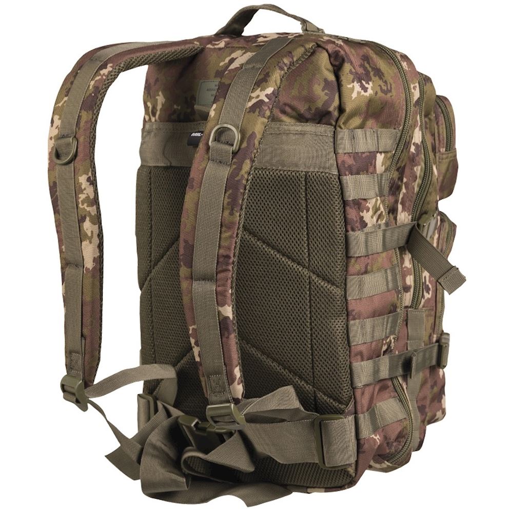 Zainetto Tattico colore vegetato mimetico -Materiale: Poliestere ricoperto in PVC. -Volume totale: 36 litri -Dimensioni: 51 x 29 x 28 cm – Schienale imbottito – Design ergonomico – Spallacci imbottiti, circa 5 cm di larghezza, regolabili in lunghezza – Sistema “molle” incorporato per fissare materiale aggiuntivo – Interamente regolabile – Maniglia superiore di trasporto – 2 grandi tasche con zip e vari compartimenti interni – 1 tasca anteriore con “organizzatore” per gli oggetti e uno scomparto con zip – Zip a doppio senso – Cinghie di compressione laterale per controllo del volume e la fissaggio dei bagagli – Tasca porta…