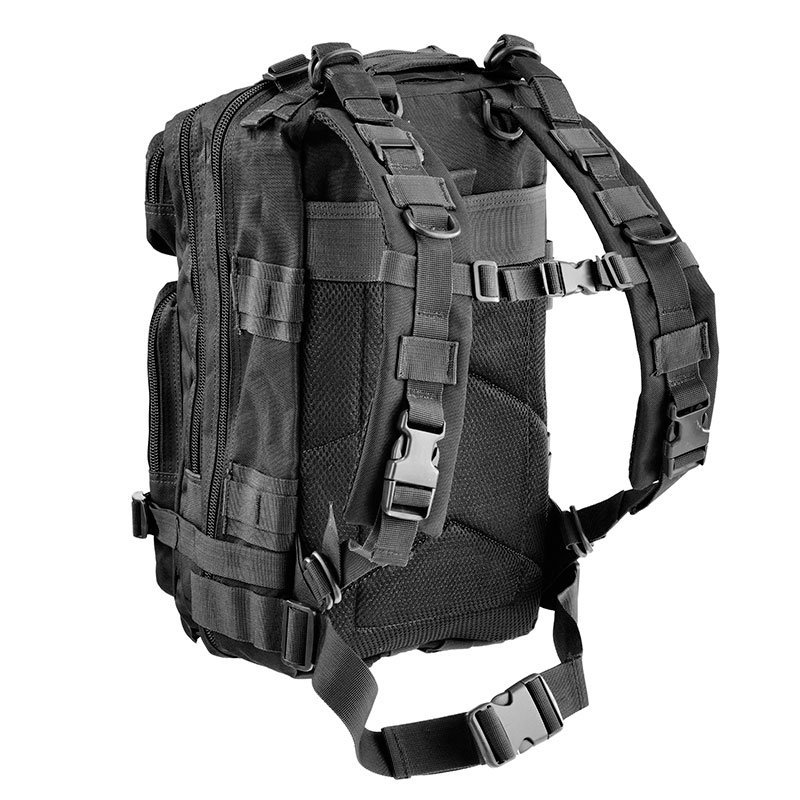 Zaino tattico 30 Litri. Lo zainetto è composto da una tasca principale e da una tasca secondaria nella quale sono posizionate diverse tasche a scomparsa per contenere documenti, cartine topografiche ed accessori vari. Inoltre nella parte frontale ci sono 2 ulteriori tasche. Ha una maniglia di trasporto ed evacuazione ed è ricoperto da sistema MOLLE. Gli spallacci sono imbottiti, regolabili in altezza tramite cinghie e fibbie a scorrimento così come la fascia lombare. Nel retro c’è una taschina apribile tramite velcro, dove esiste la possibilità di inserire la tasca hydro.