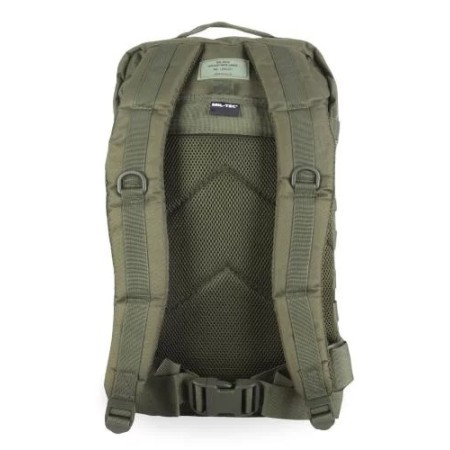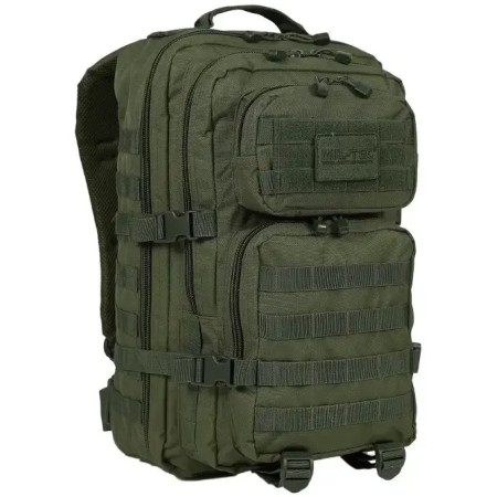 Zainetto Tattico colore verde oliva militare. -Materiale: Poliestere ricoperto in PVC. -Volume totale: 36 litri -Dimensioni: 51 x 29 x 28 cm – Schienale imbottito – Design ergonomico – Spallacci imbottiti, circa 5 cm di larghezza, regolabili in lunghezza – Sistema “molle” incorporato per fissare materiale aggiuntivo – Interamente regolabile – Maniglia superiore di trasporto – 2 grandi tasche con zip e vari compartimenti interni – 1 tasca anteriore con “organizzatore” per gli oggetti e uno scomparto con zip – Zip a doppio senso – Cinghie di compressione laterale per controllo del volume e la fissaggio dei bagagli – Tasca…